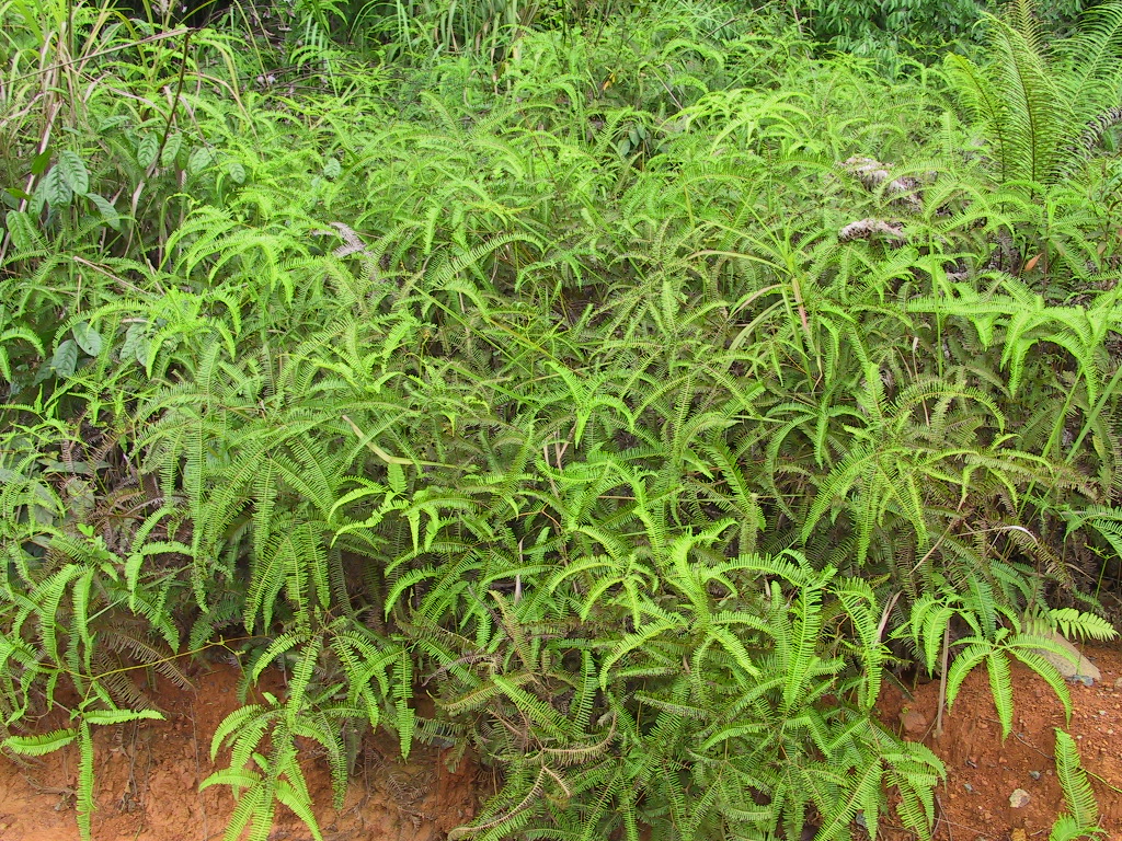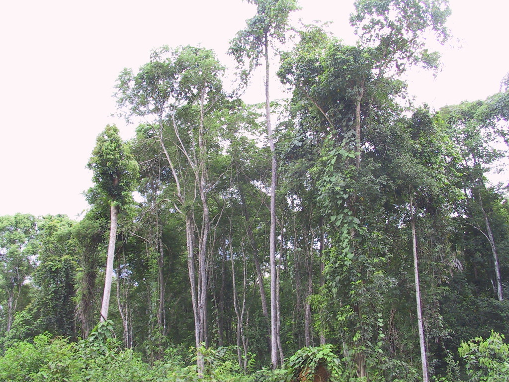着いたところは小さな集落。大きな林は周りにはない。メランティは切りつくしてもう1本もないという。見渡すと、農地やアランアランの向こうに二次林が見える。スンカイはこっちだと、案内の社長が二次林の中へ導く。 二次林の中で、スンカイは明らかに優占種になっている。繁殖の形態から言っても、パイオニア的存在の樹種だから、スンカイを伐採すれば、またそこにスンカイが出てくる。スンカイだらけの森林だ。